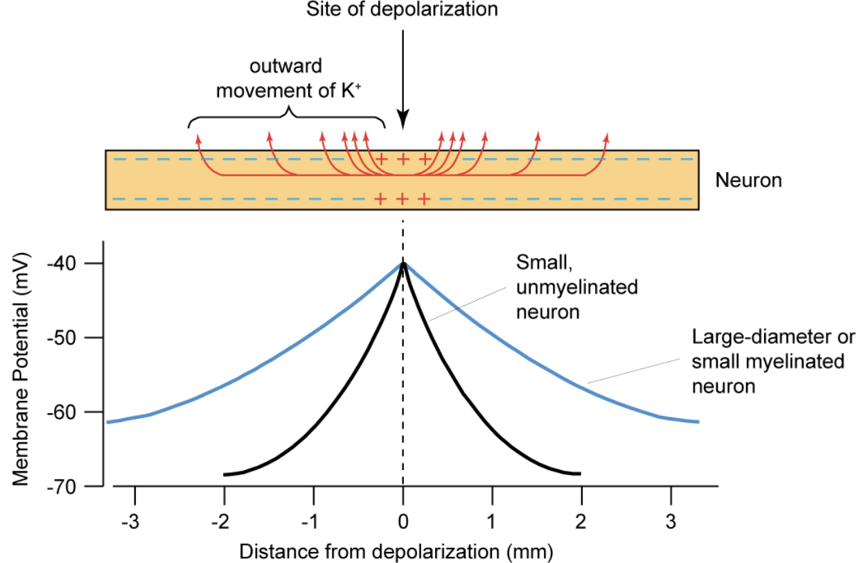 How does the release of K+ at an action potential vary with distance from the site of depolarisation?
