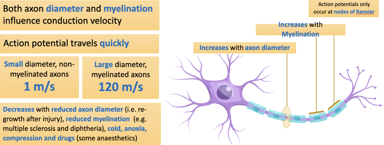 What factors increase/decrease conduction velocity?