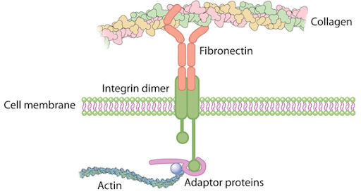 -integrins sit in membrane and bind to cytoskeleton and extracellular matrix on either side
