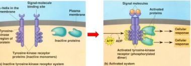 -when specific signals bind to receptor, they move together so tyrosine (signal molecule) becomes phosphorylated