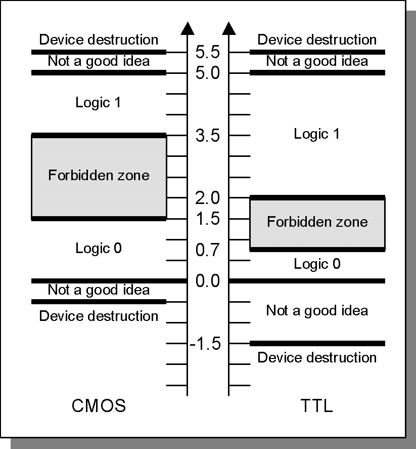CMOS devices appear to behave as simple threshold devices so it can be assumed that voltages less than 0 are treated as logic ‘0’ whilst voltages greater than 1<strong>threshold</strong> are treated as logic ‘1’. For voltages in between manufacturers make no promises.