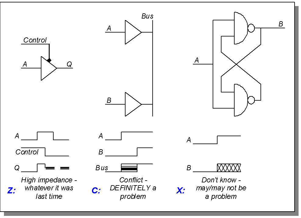 This is a low-impedance signal (forcing) but we don’t know what the value is. Again, it cannot occur in reality - a ‘0’ is a ‘0’, a ‘1’ is a ‘1’, but a ‘X’ will be either a ‘0’ or a ‘1’.
