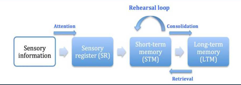 A model proposing that memories are developed in a linear fashion between separate memory stores and that rehearsal is required to form long-term memories.