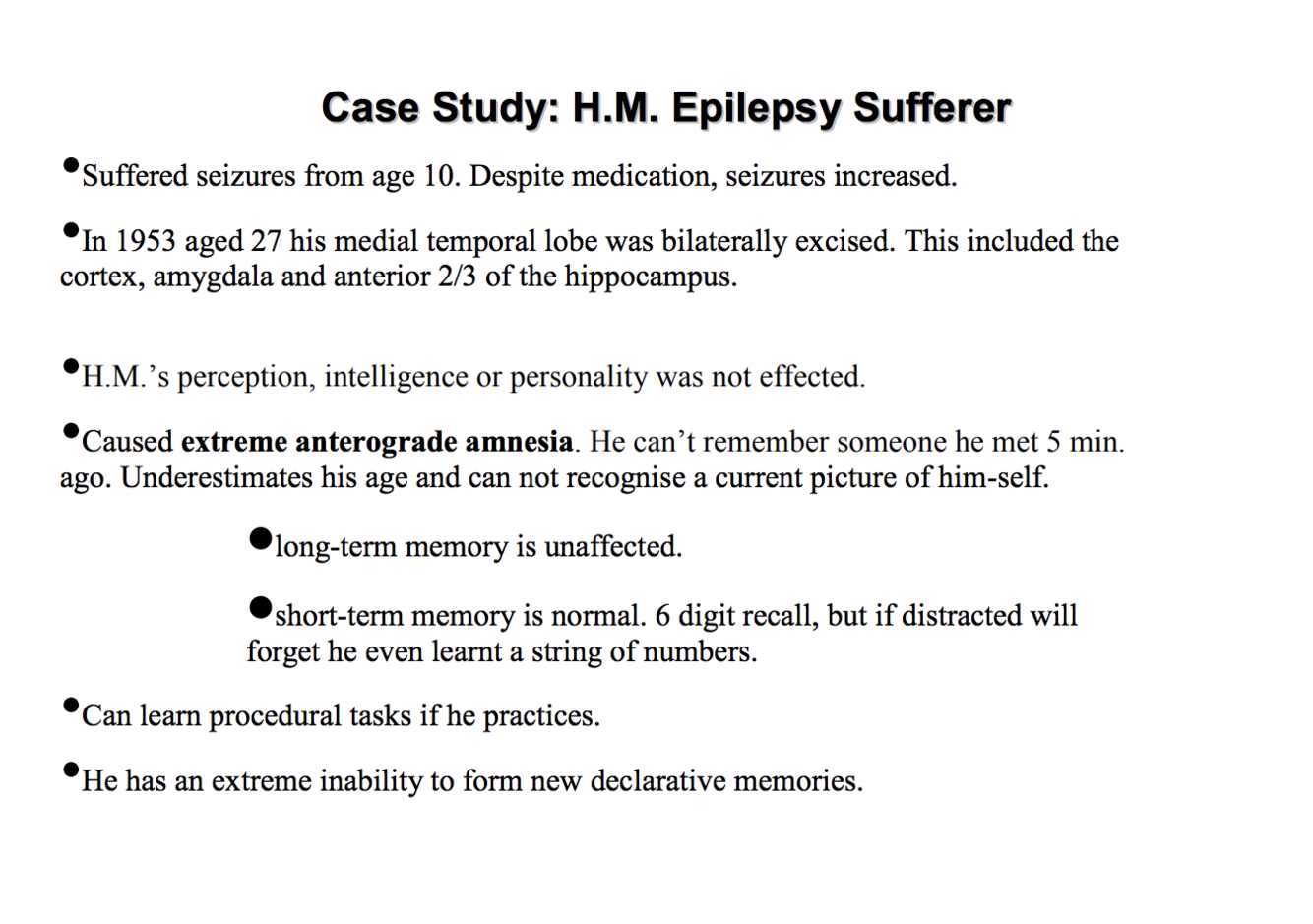 In the case of H.M., the removal of much of the temporal lobes mostly affected his: a. procedural memories b. declarative memories c. personality d. intelligence e. intelligence