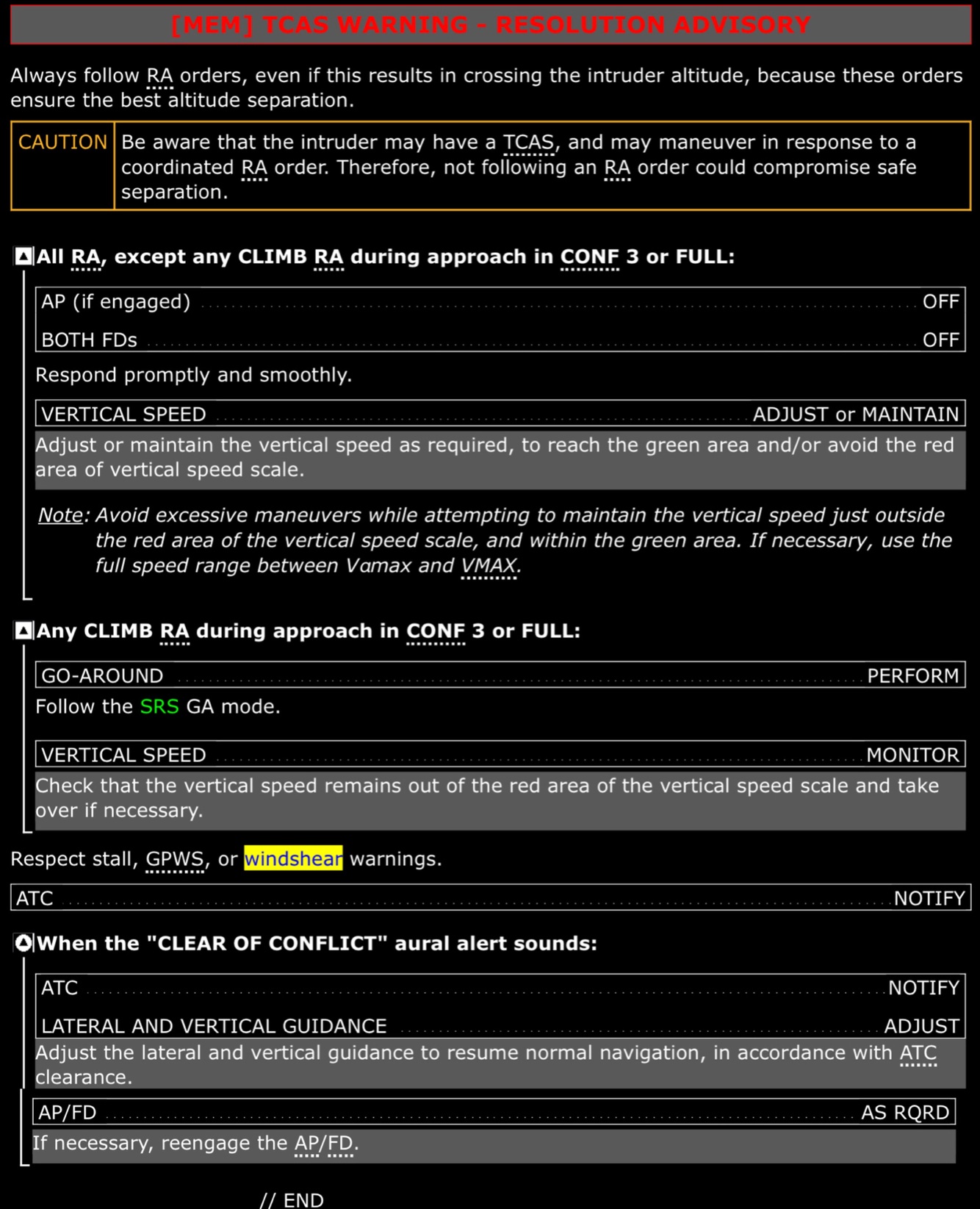 TCAS Caution (TA) and Warning (RA) procedure