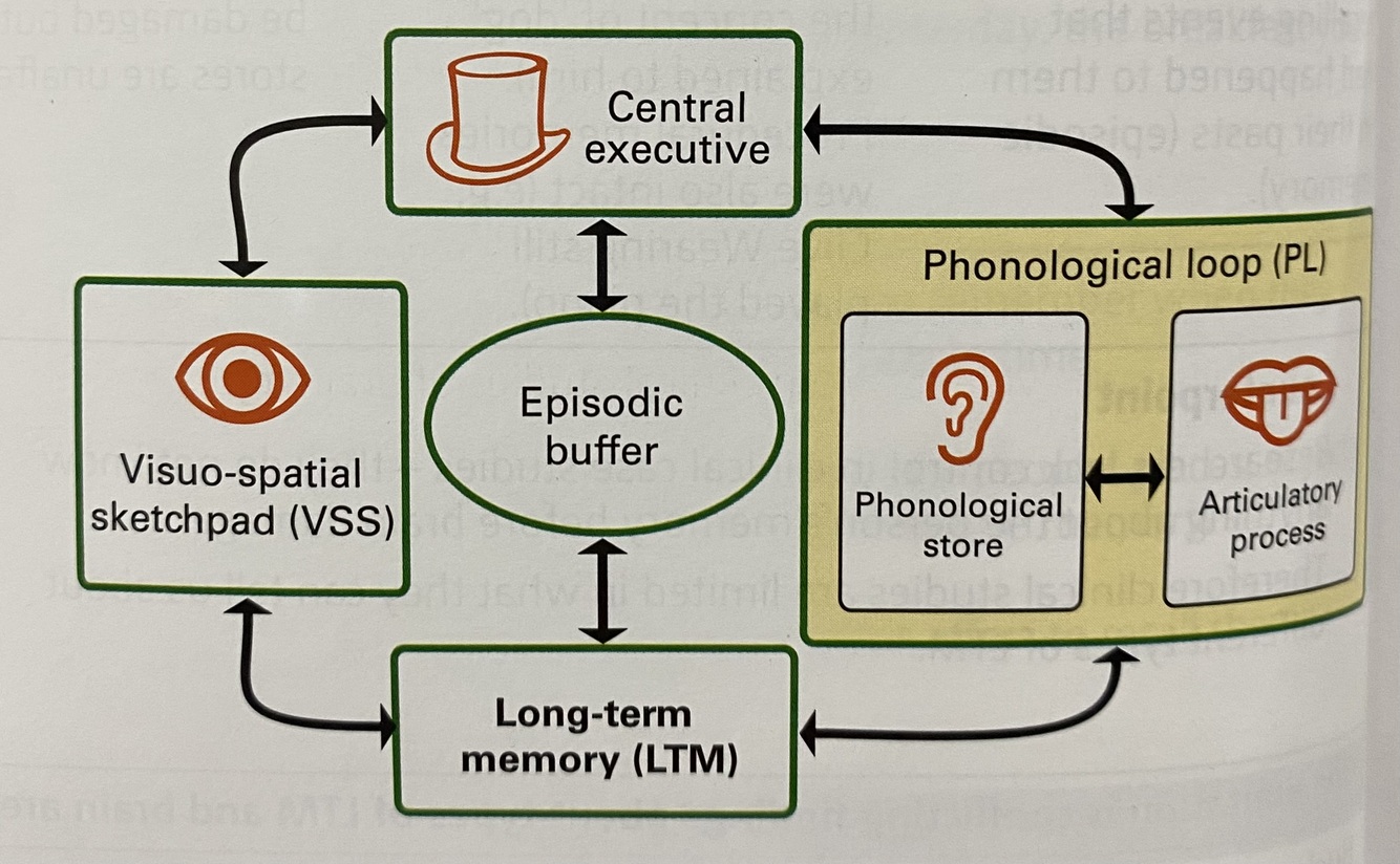 -his STM for auditory info was poor (damaged PL) but he could process visual info normally (intact VSS)