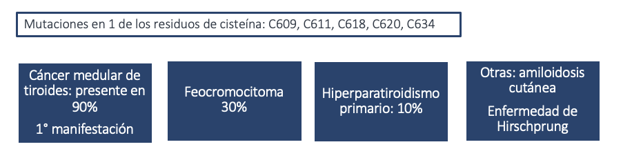 Mutaciones en el protooncogen RET (ganancia de función: proliferación descontrolada celular) cromosoma 10q11