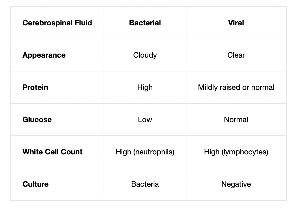 Briefly differentiate between the CSF of bacterial and viral meningitis