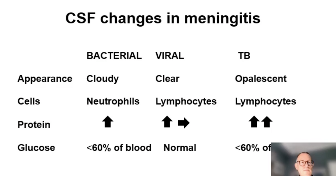 Describe the CSF changes in meningitis for bacterial, viral and TB infections