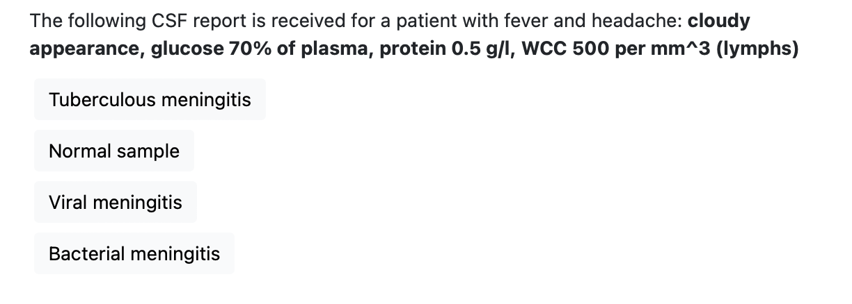 - It allows for collection of cerebrospinal fluid (CSF) which can be analysed for signs suggestive of viral infection such as lymphocytic pleocytosis, normal or slightly elevated protein levels, and normal glucose levels.