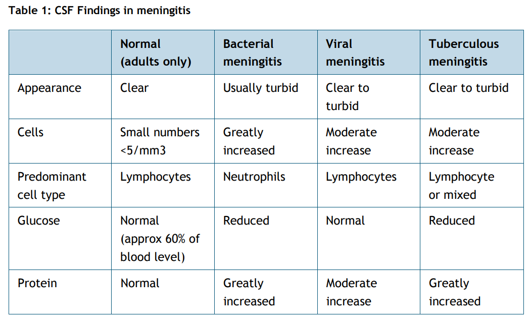 CSF findings, appearance for:
