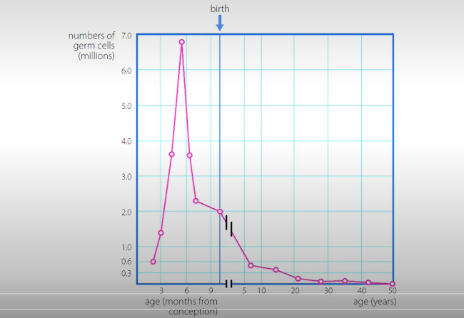 Changes in the number of germ cells in the human ovary during fetal development and throughout postnatal life.