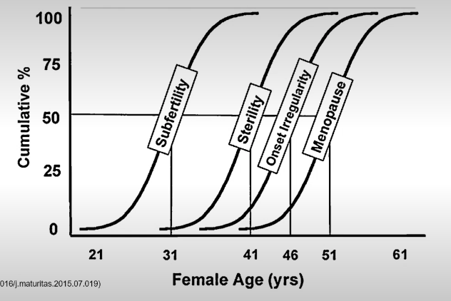 The ovarian reserve will determine the onset of subfertility to sterility and to complete loss of menstrual cycles (menopause)