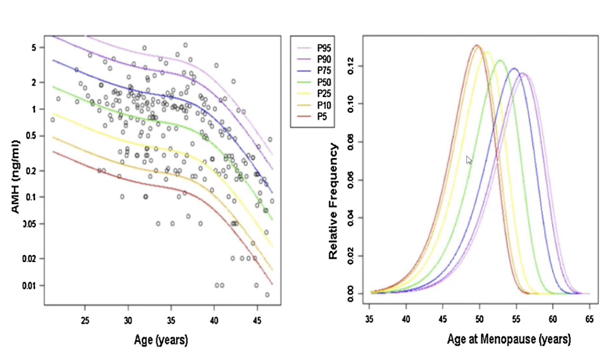 The global age at menopause is on average 51 years (range 40-60 years) suggesting a distinct genetic control; strong correlation exists between mothers and daughters.