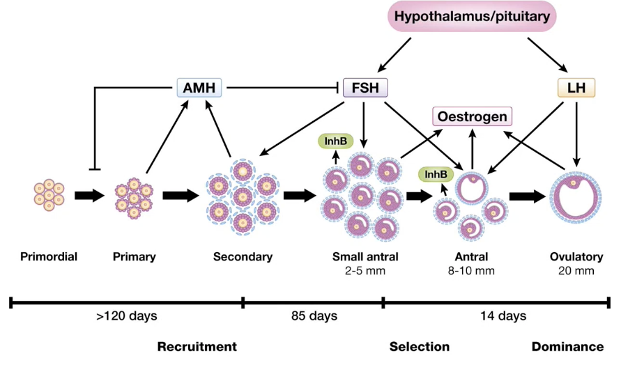 1. AMH and Inhibin B levels decrease so less suppresion of FSH, as you approach menopause follicle number decreases so less inhibin B keeping FSH levels low = increase in FSH levels