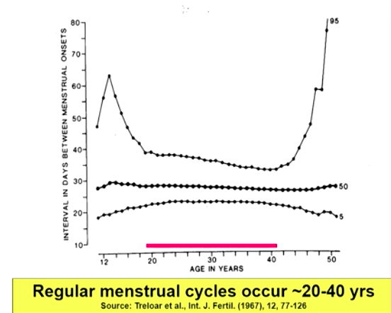 Pre-menopause: 40 to age of irregular menstrual cycles (~46 yrs)