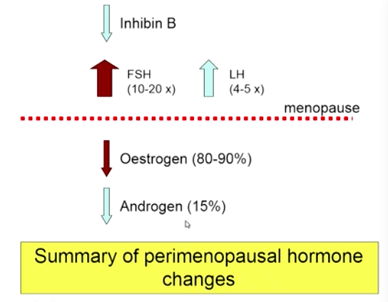 FSH: loss of negative feedback from inhibin, begins to rise ~7-8 yr prior to menopause. Remains high after (clinical diagnostic indicator)