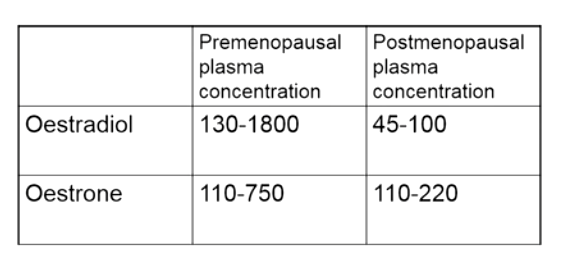 Estrodial: Produced by granulosa and thecal cells in follicles, high up till 2 years prior to menopause, then comes crashing down