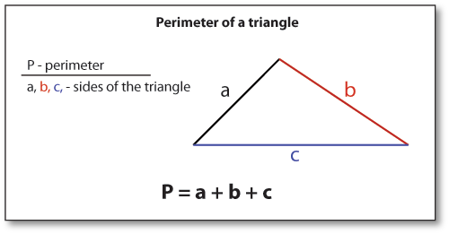 The perimeter is the total distance around the outside, which can be found by adding together the length of each side.
