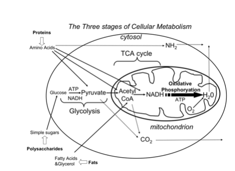 “Sketch a cartoon of the three stages of cellular metabolism that convert food to waste products in higher organisms, illustrating the cellular location of each stage. ”