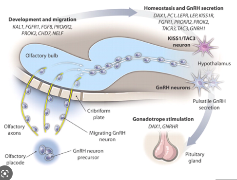 During embryonic development GnRH neurones migrate through cribiform plate, guided by Kal protein & migrate to the hypothalamus
