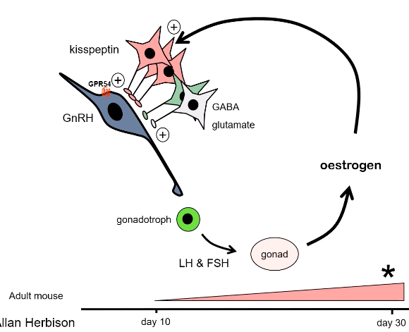 Gonad makes oestrogen, which has a positve effect on kisspeptin via GPR54 receptor