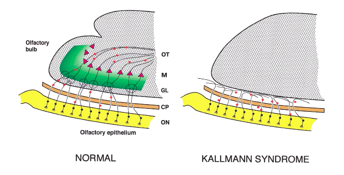 During embryonic development these cells can’t enter brain: doesnt take neurones to hypothalamus / olfactory bulb