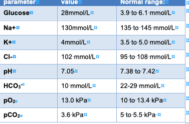 Elevated anion gap metabolic acidosis (low pH, low bicarb). [1 mark]