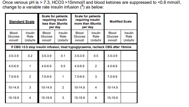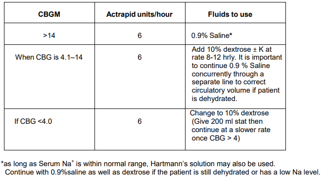 - Start Insulin Infusion at 6 units per hour and continue to do so until acidosis corrected, i.e. venous bicarbonate >15 mmol/l or blood ketones < 0.6 mmol/l.
