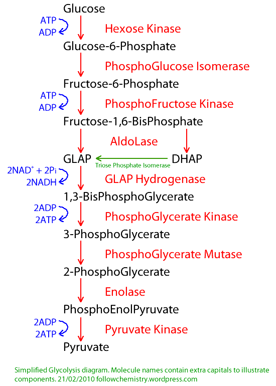 Enzymes: Hexokinase/Glucokinase, phosphoglucoisomerase,PFK-1, Aldolase A, Triosephosphate isomerase, GAP dehydrogenase, phosphoglycerate kinase, phosphoglycerate mutase, enolase, and pyruvate kinase