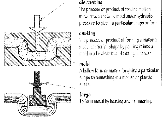 The process or product of forcing molten metal into a metallic mold under hydraulic pressure to give it a particular shape or form.
