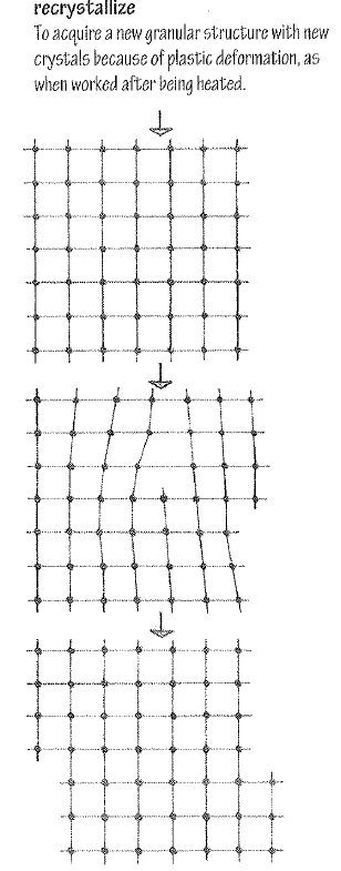 To acquire a new granular structure with new crystals because of plastic deformation, as when worked after being heated.