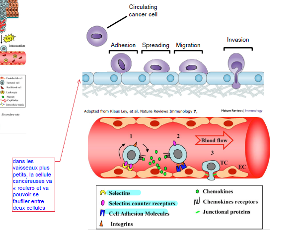 Dans les vaisseaux sanguins plus petits (capillaires), la cellule cancéreuse va «rouler» et va pouvoir éventuellement ralentir pour se faufiler entre deux cellules