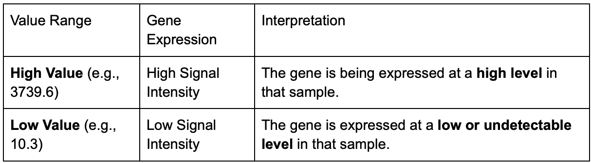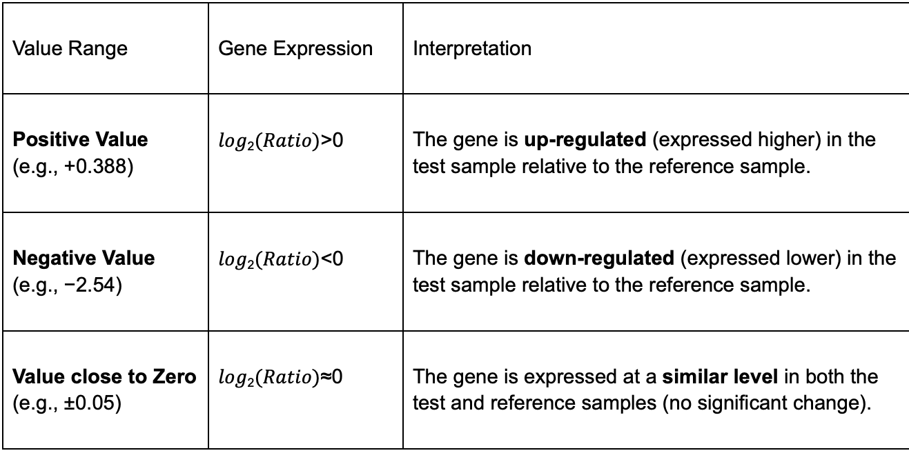 Explanation of the Data Table - Interpreting the Numerical Values (Log Ratios)