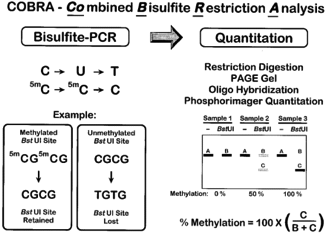 COBRA exploits the creation of new methylation-dependent restriction sites or the maintenance of restriction sites in a methylation-dependent manner after bisulphite treatment.
