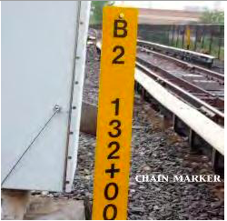 “Chain Marker: A measurement system sign displayed every 100 feet along the Rail Roadway. The sign denotes the distance in feet from the HUB, the center point of the line (either Metro Center or Gallery Place). A chain marker written as K2 [color] 525+00 would be interpreted as K line, track 2, Orange Line, 52,500 feet from the HUB. The signs appear between the tracks or are affixed to the fence along the at-grade or elevated Rail Roadway, or mounted on the walls of the tunnels throughout the Metro system. Chain markers may also be found on ancillary buildings or rooms as a means of fixing their location within the system.”
