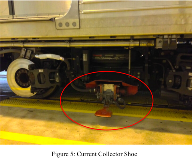 “Collector Shoe (see also Paddle): The car-borne device designed to slide on the third rail to pick up DC propulsion current. The collector shoes are located in the center of each truck assembly on each side, four shoes per rail car.”