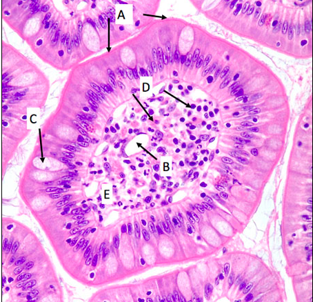 A = **enterocyte brush border** B = **lacteal** C = **goblet cell** D = **immune cells (lymphocytes)** E = **lamina propria**