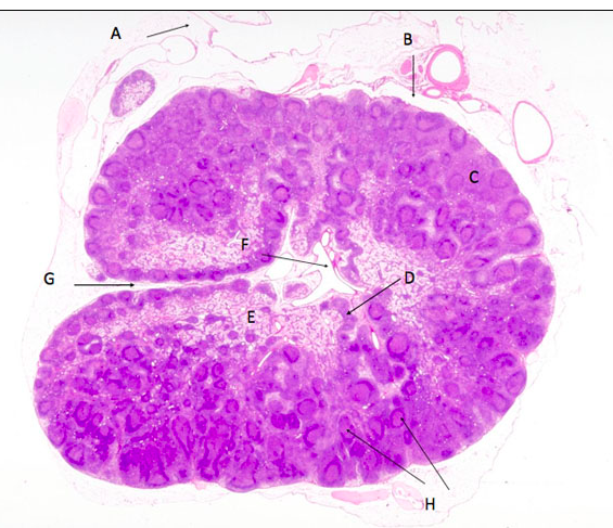 A = afferent lymphatic, B =subcapsular sinus, C = cortex, D = medullary cords, E = medulla, F = efferent lymphatic, G = hilus, H = secondary follicles