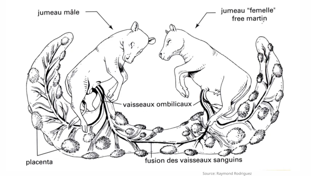=>etiologie: Développement d’anastomoses vasculaires placentaires= Fusions placentaires dans >90% des gestations gémellaires bovines