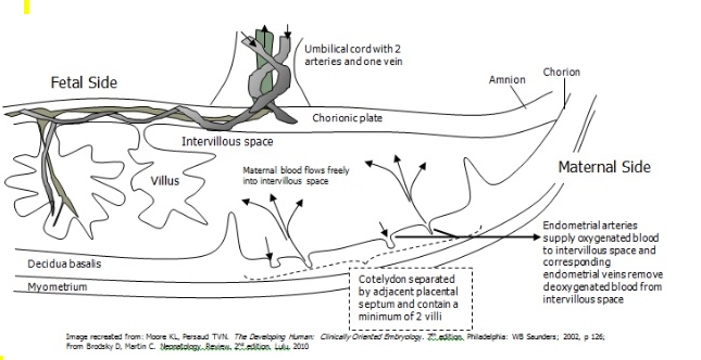 How blood flows from mother to fetus; how facilitated diffusion occurs and gas exchange