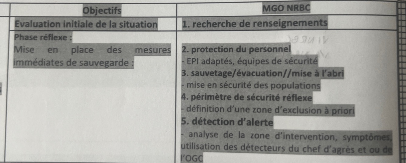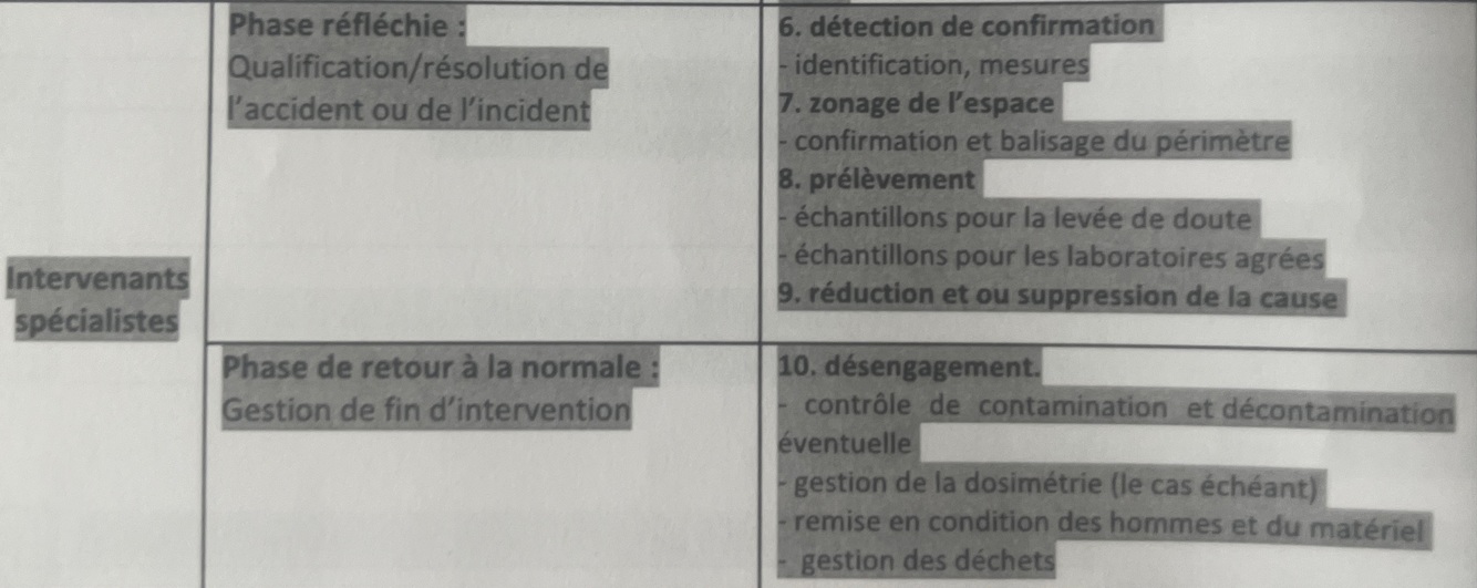 Arrêt avant adresse / EPI / Controle explo atm et espace clos/. Engagement min (binome et a vue). Equipe de sécurité. Si incendie : min d’eau + controle ecoulement. Matiere fissiles ou réagissant avec l’eau: interdire l’eau et matière humide