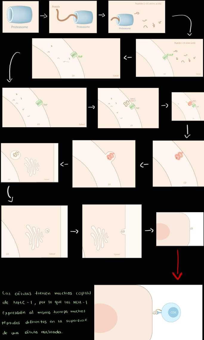 MHC I: reconoce péptidos de 8 - 10 aminoácidos de longitud.- Pasan por proteosoma- Reconocen al correceptor CD8.