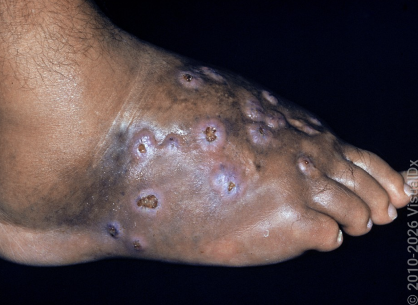PÁPULAS Y NÓDULOS ROSADOS Y VIOLÁCEOS CON COSTRAS CENTRALES (SENOS), QUE SURGEN EN UN PIE EDEMATOSO E HIPERPIGMENTADO.