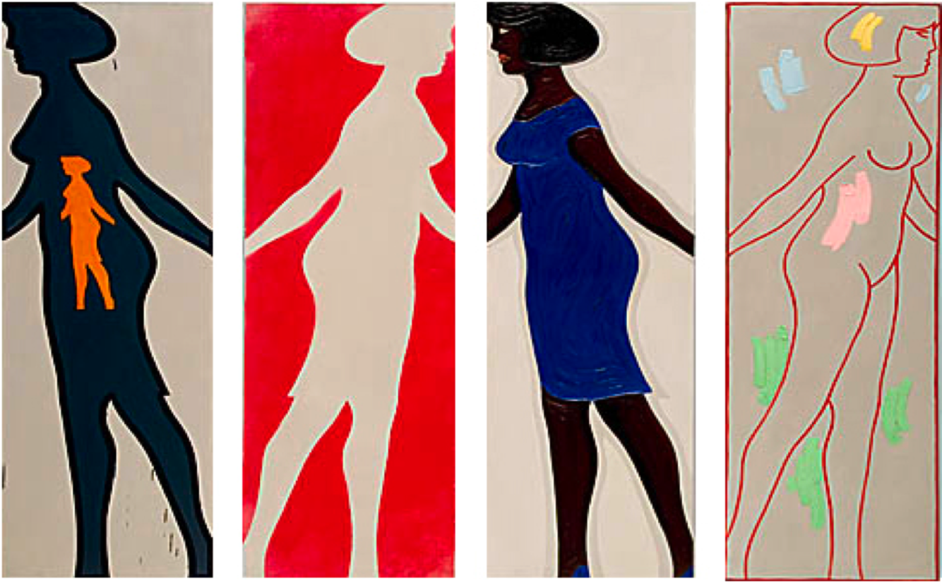 MICHAEL SNOW, FOUR GREY PANELS AND FOUR FIGURES, 1963, OIL ON CANVAS, EACH PANEL APPROX. 152.5 X 51 CM