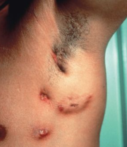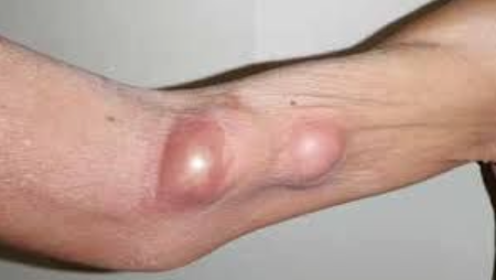 Aparición de nódulo subcutáneo, nódulo supuran drena. síntomas febriles
