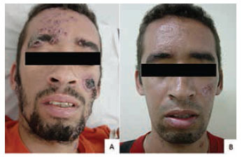 Acometimento cutâneo-mucoso: lesões polimórficas em lábios, cavidade oral e VAS