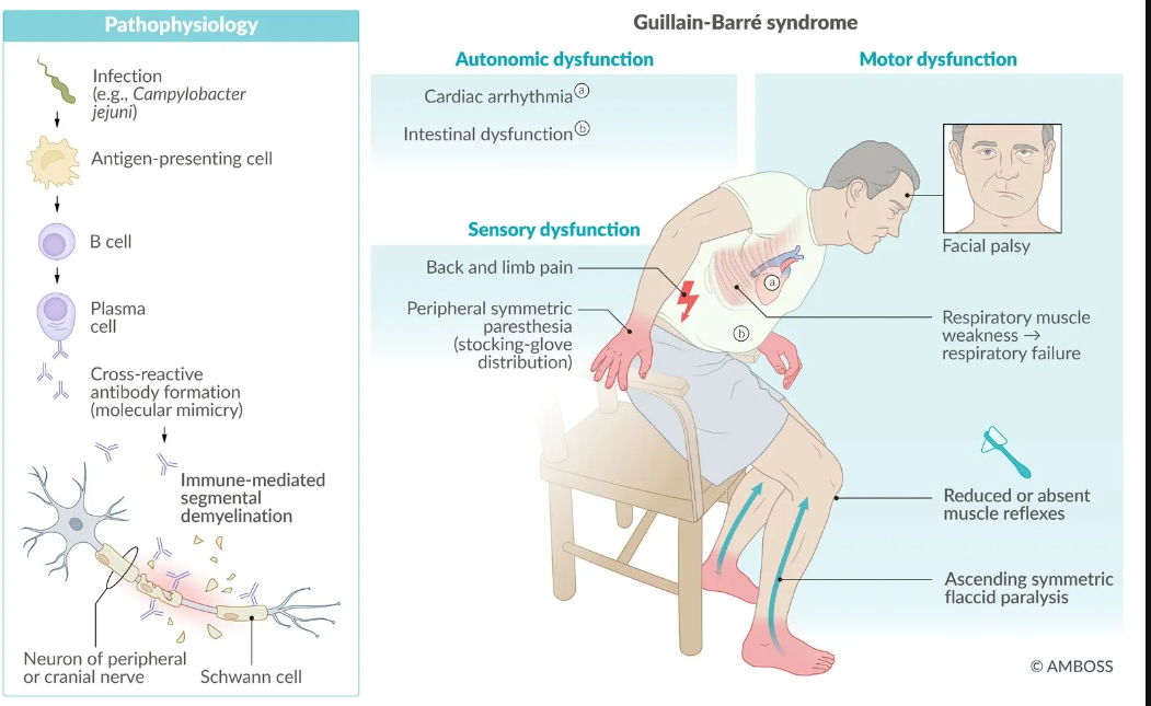 se manifiesta comouna debilidadagudade la neurona motora inferiorquecomienzade forma asimétricaen lasextremidades inferioresy asciende durante horas o días.