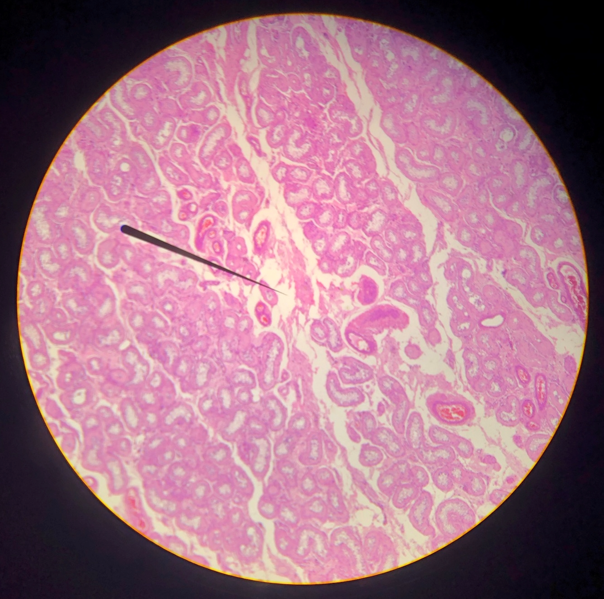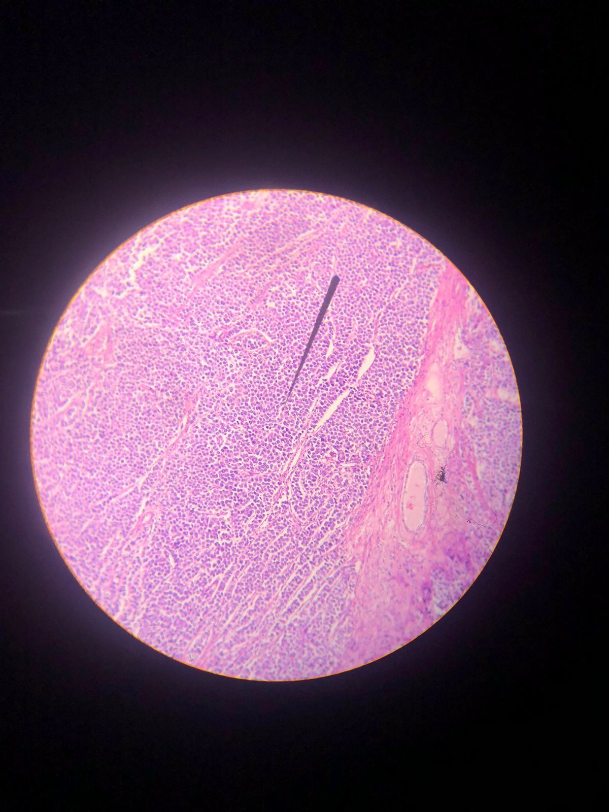 Descrição: Apresenta aglomerados de células formando ninhos de células mais claras no meio do córtex. São ninhos de células transicionais, semelhante ao epitélio da bexiga, que está envolvido por tecido fibroso. Também apresenta neomorfismo que altera o formato e o tamanho do núcleo desses ninhos.