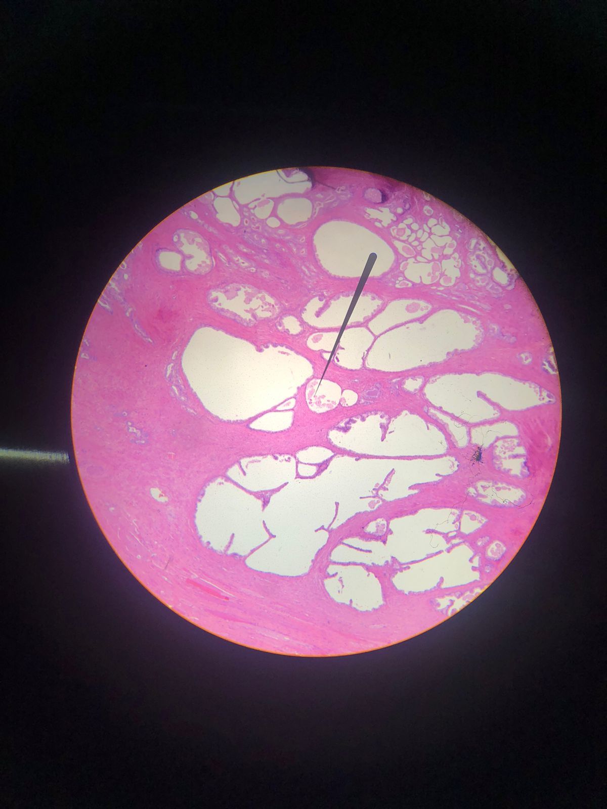 Descrição: Amplos espaços nas glândulas prostáticas, aumento da luz das glândulas, estratificação das células das glândulas (duas camadas de células). Na região de adenocarcinoma as células são vacuolizadas. Células basais achatadas na periferia da região de hiperplasia.